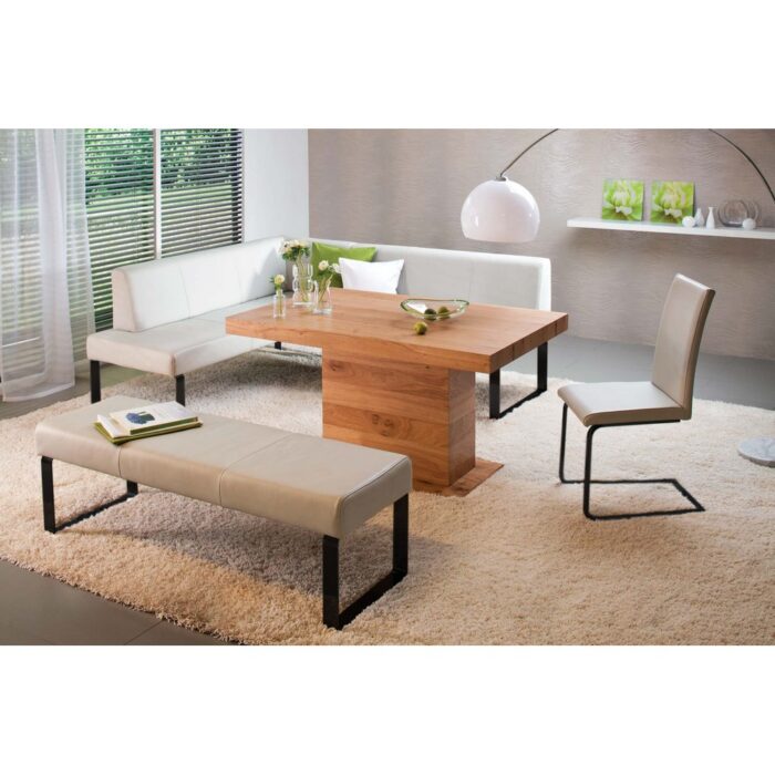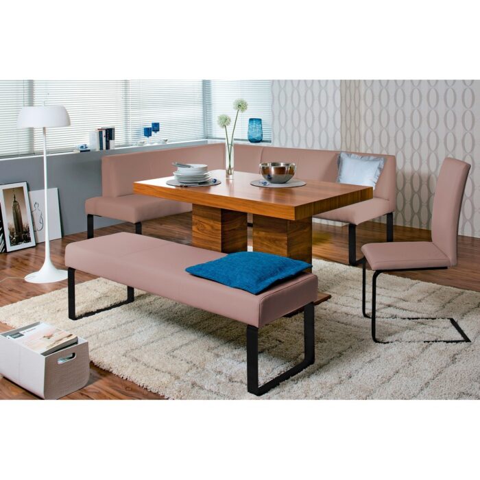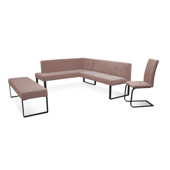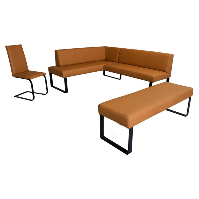 Modern étkezőgarnitúra széles elemválasztékkal, fekete design-lábbal. Többféle lehetséges összeállításának köszönhetően térben vagy fal mellett, sarokban egyaránt elhelyezhető, rendelhető támlával vagy anélkül is.